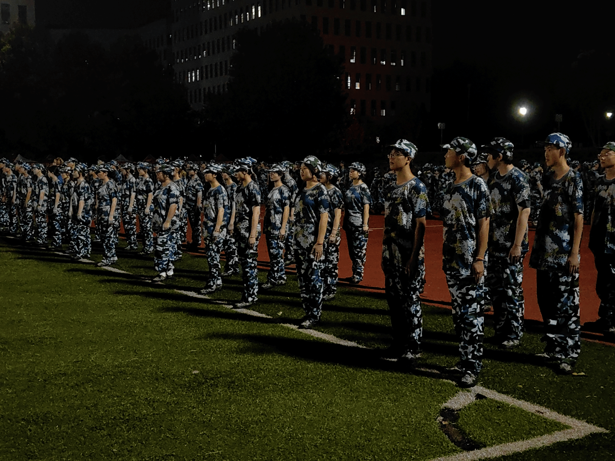 夜晚同学们依旧不松懈片刻,在明亮的灯光下安然矗立,不怕苦不怕累,夹带着还没干去的汗水与雨水,从转军姿、稍息、立正、跨立等基础训练起,每一个动作教官都有亲自拆分示范与指导从摆臂到踢腿,从握拳到绷脚,教官们铿锵有力的命令响彻操场,耳边时不时能传来同学们嘹亮的《团结就是力量》的整齐歌声,一声又一声振奋着每一个人的士气。
