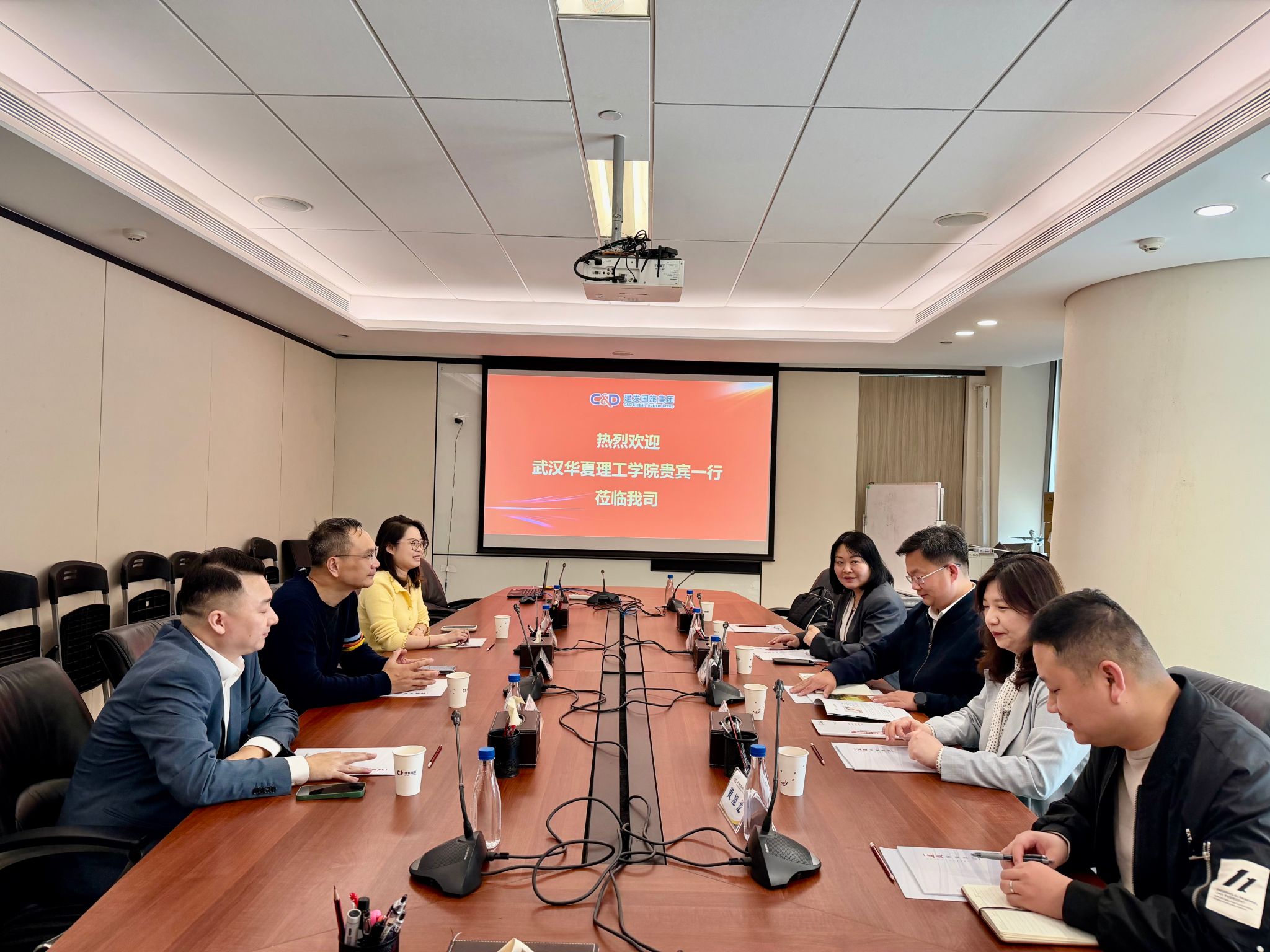 建发国旅集团、建旅会展传媒集团副总经理张晓鹏等业务部门负责人热情接待了学院一行。双方在集团会议室展开座谈,张总就集团文旅产业布局、精品旅游线路打造、文旅融合项目运营及数字化转型等核心工作,尤其是新阶段文旅行业复苏升级的新态势、新机遇,以及企业对高素质专业人才的迫切需求做了详细介绍。蔡姗、徐曼两位老师就共建企业实战案例库、优化企业导师进课堂等具体工作与企业负责人交换了意见。