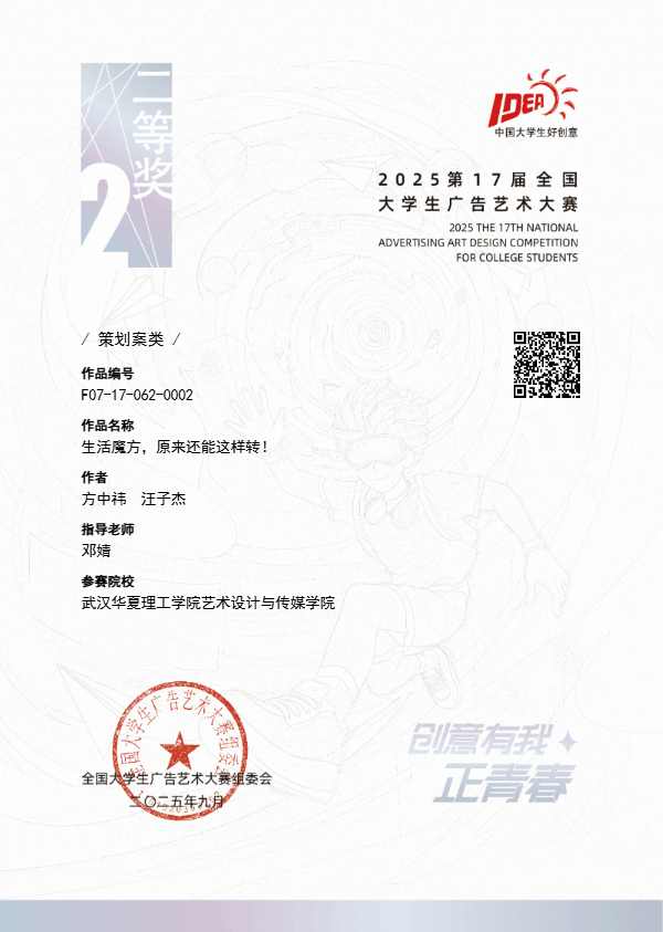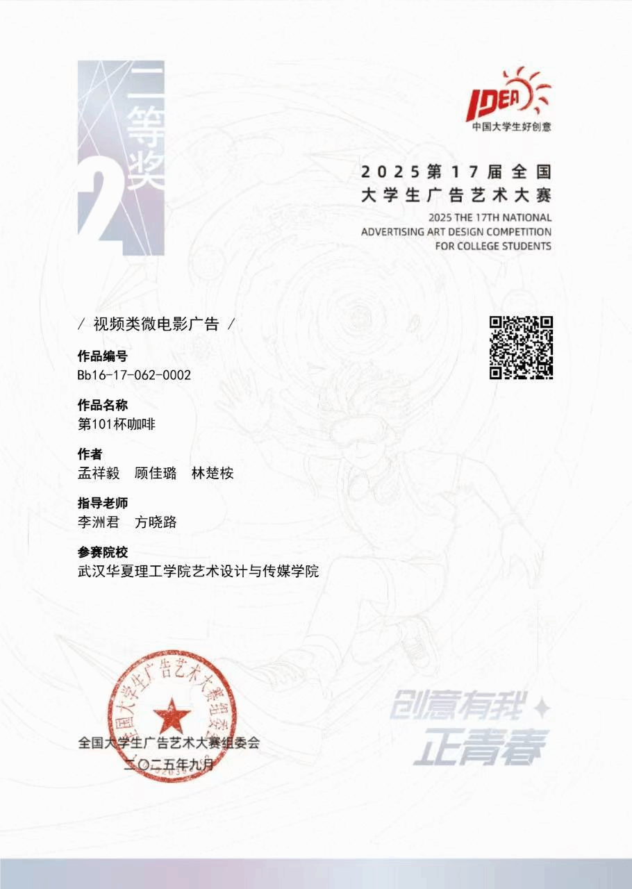 在今年的第十七届大广赛中,我院师生踊跃参赛。共斩获了国家级奖项5项,省级奖项31项。其中视觉传达设计专业学生拍摄的视频类微电影广告《第101杯咖啡》和策划案《生活魔方原来还能这样转》分别获得国家二等奖。