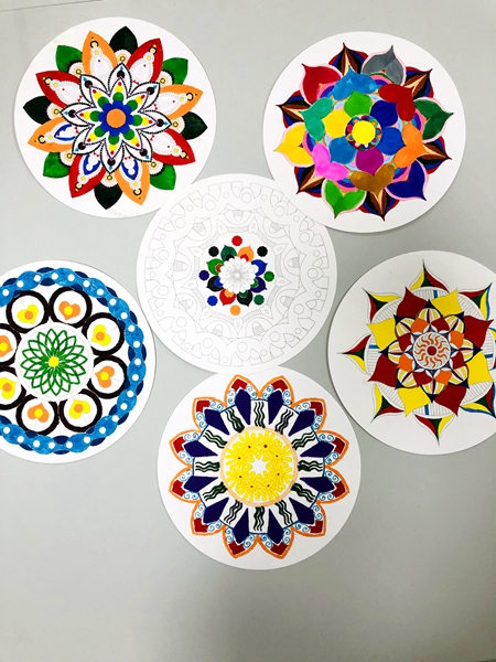 在约两小时的涂色放松过后,同学们完成了自己的作品并分享了自己在涂色过程中的感受:有的同学说,仿佛回到了小时候在幼儿园涂鸦的那段时光,无忧无虑、无拘无束;有同学说涂色的过程非常考验耐心,本来浮躁的心慢慢放慢了下来,越是耐心越是专注,涂色便越得心应手;有的同学说,没想到随意涂色的图案居然也这么美丽。至此,第三次手工减压活动圆满结束。