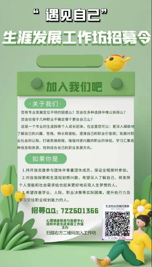2022年4月29日晚6:00-8:00,由我校心理健康教育中心、扬帆华夏生涯发展工作室联合举办的“遇见自己”生涯发展工作坊在综合楼1401开展第一次团体活动。经过前期宣传招募,共有50多名学生加入生涯发展工作坊。这一期经过问卷访谈后第一批入团的同学来自各个学院,团体带领者有心理健康教育中心专职咨询师刘轶老师、兼职咨询师智能制造学院就业工作负责人汤雁老师和扬帆华夏职业生涯工作室负责人信息学院党总支书记ECE教练型教育者张平副教授带领。