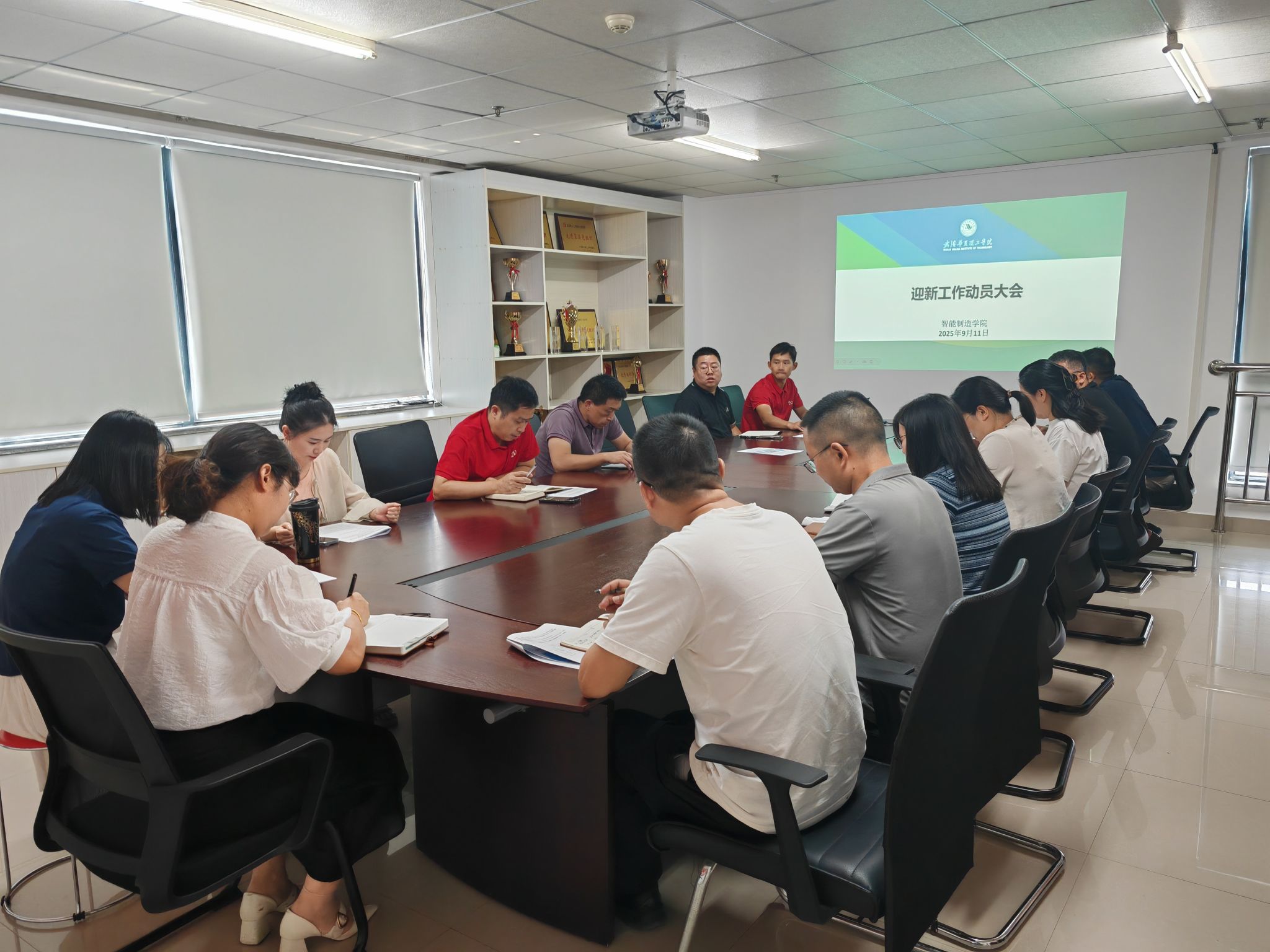 9月11日中午,智能制造学院在综合楼919会议室召开迎新工作动员大会,统筹推进2025年梧桐湖校区迎新工作。执行院长齐洪方,党总支副书记靳路民,副院长汪芳、李媛,各系部中心主任,学工办、教学行政办全体教师参会。