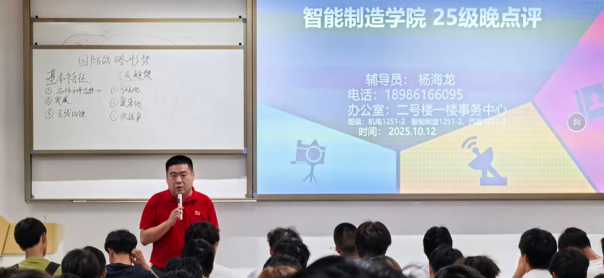 为增强新生的安全防范意识,筑牢校园反诈防线,10月12日,智能制造学院针对2025级新生组织了以“防电信诈骗”为主题的晚点评教育活动,本次活动由辅导员杨海龙主讲,机电1251-2、智能制造1251-2、汽服1251-2等班级全体新生参与。
