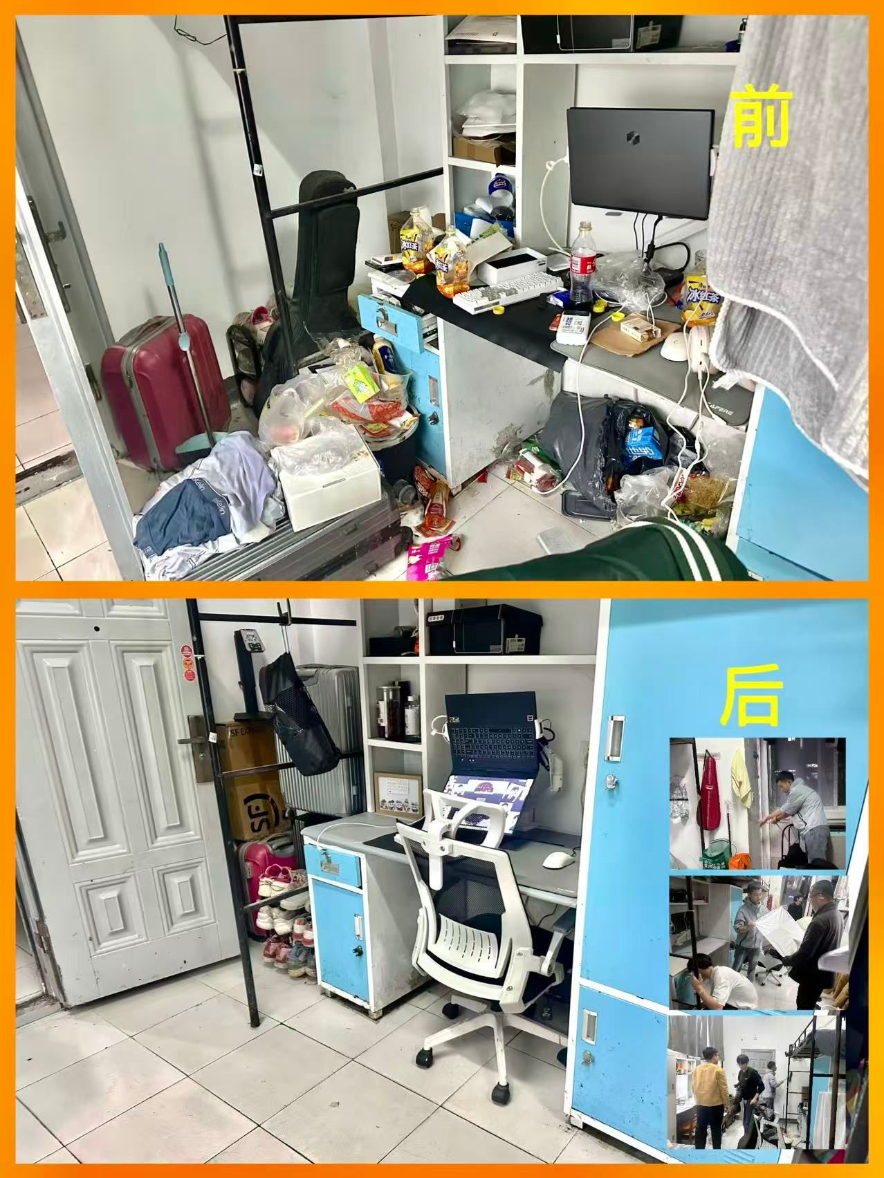 检查过程中,向胜涛主任带头深入宿舍一线,针对洗漱台缝隙、洗衣机底部、厕所角落等易被忽视的卫生死角,一边现场讲解清洁技巧,一边亲自上手清理积垢,用实际行动为学生作出示范。全体辅导员则按分工逐寝推进,遇到卫生不达标的宿舍,不搞“一刀切”批评,而是俯下身与学生一同擦拭台面、整理物品、清扫地面,手把手教方法、传经验。在师生协作下,原本杂乱的桌面变得整齐有序,藏污的角落恢复洁净,宿舍环境瞬间焕然一新。