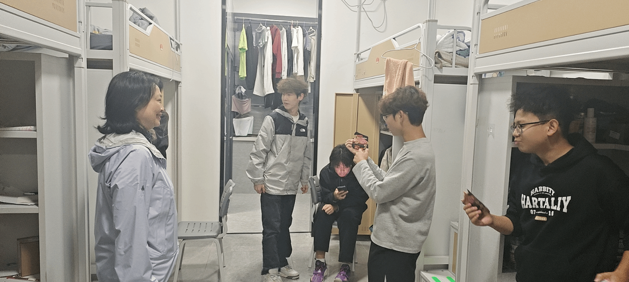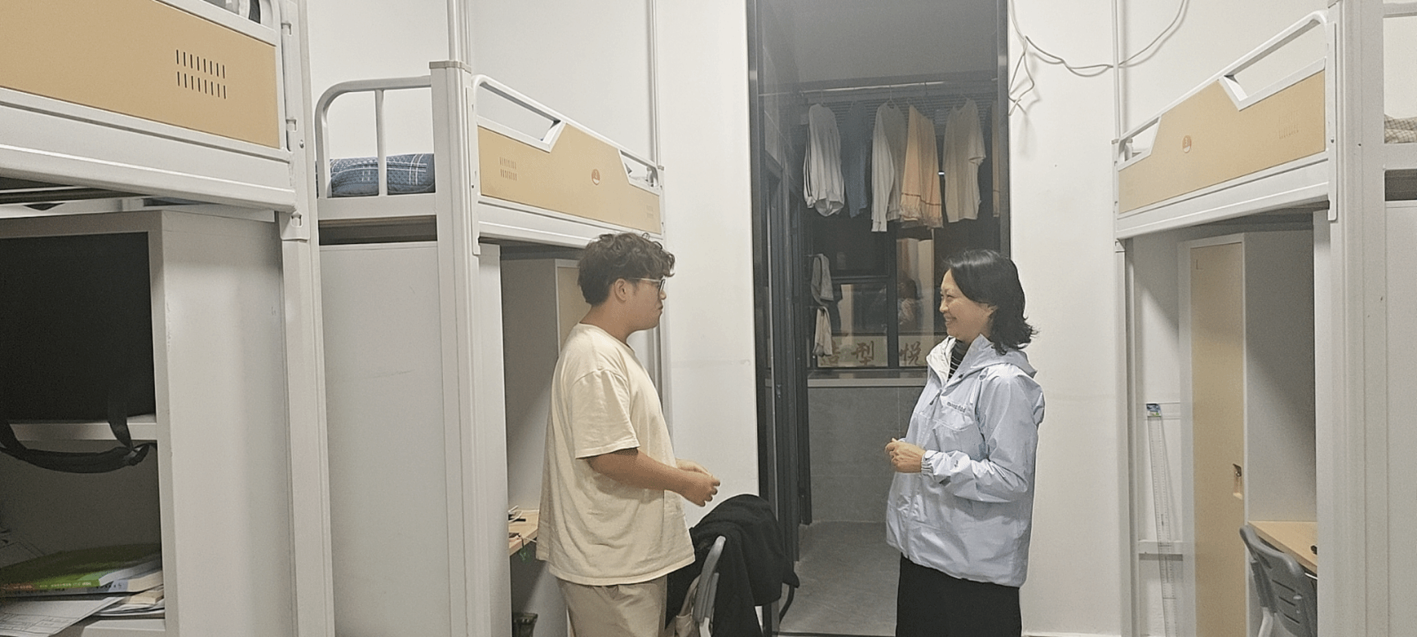 来到2栋女生宿舍,王琳老师格外关注宿舍的“安全与舒适”。在2-317寝室,她弯腰检查了下床铺台阶上的防滑垫,确认没有松动后才放心;看到有学生把书本堆在床头,她建议“可以买个小书架,既节省空间,找书也方便”。当学生提到宿舍热水器偶尔出热水慢时,她立刻掏出手机记录下来:“我明天就跟后勤部门反馈,争取尽快解决,保证大家洗漱方便。”