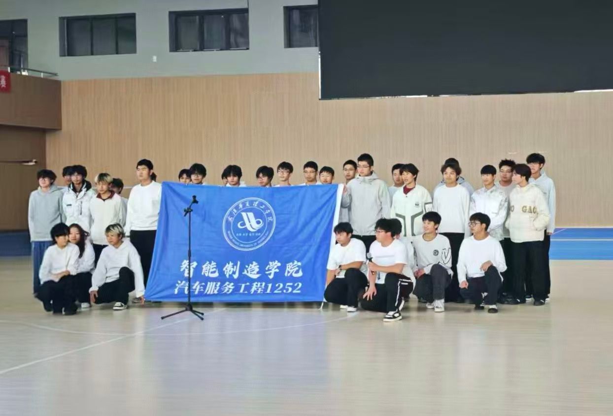 表演结束后,汽服1252班的同学们手持印有“智能制造学院汽车服务工程1252”的蓝色旗帜合影留念,将此次比赛的珍贵瞬间定格于此。