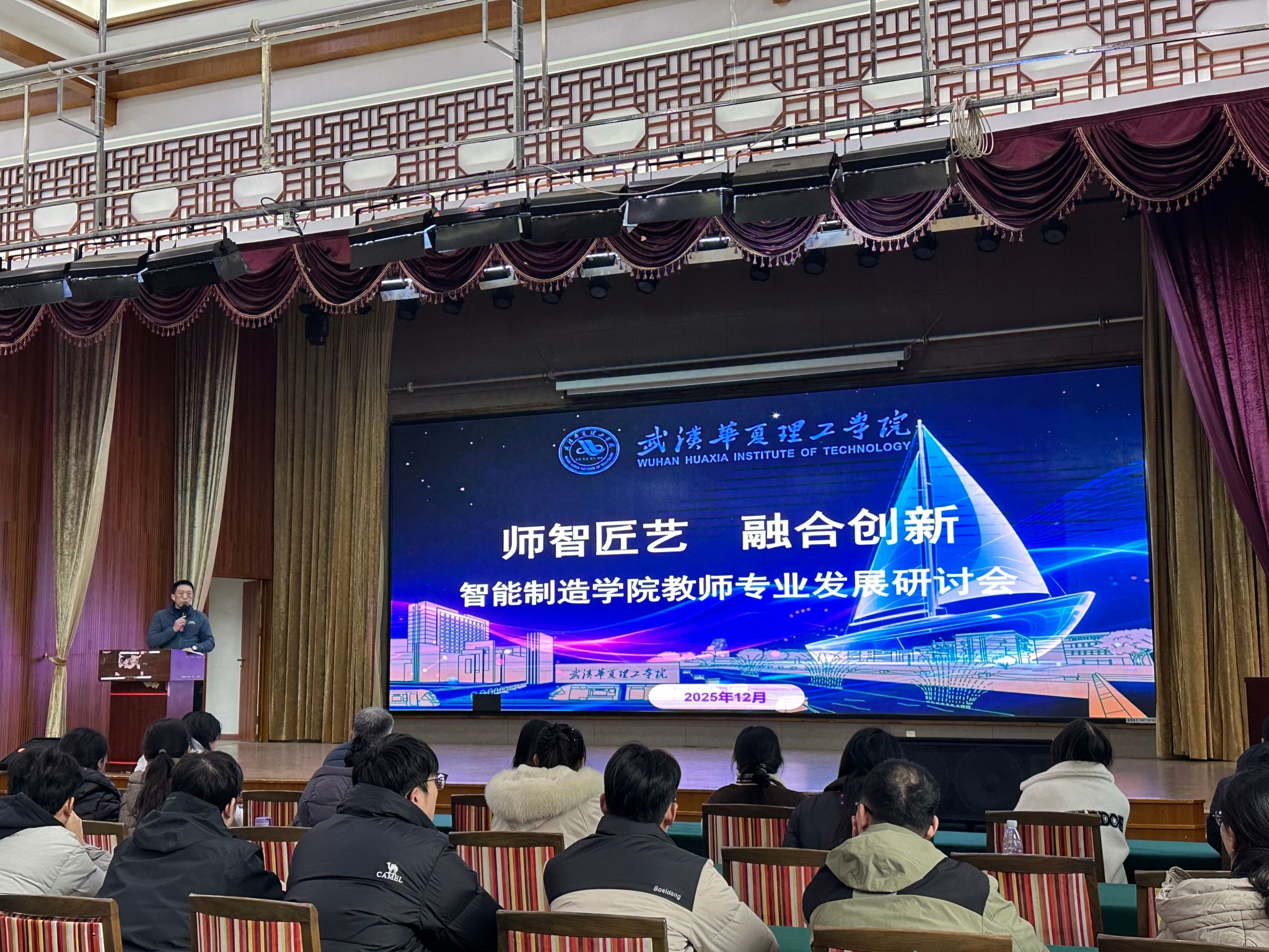 12月19日,智能制造学院在罗田三里畈隆重举办“师智匠艺:融合创新”教师专业发展研讨会。学院执行院长齐洪方在主旨演讲中深刻阐述了此次培训的时代价值与专业内涵,并发布了系统化的研修任务,标志着学院新一轮教师发展支持计划的全面启动。本次研讨会以“师智匠艺”为主题,聚焦智能制造领域教育教学创新与教师能力融合发展,为全体教师搭建了交流互鉴、协同成长的平台。