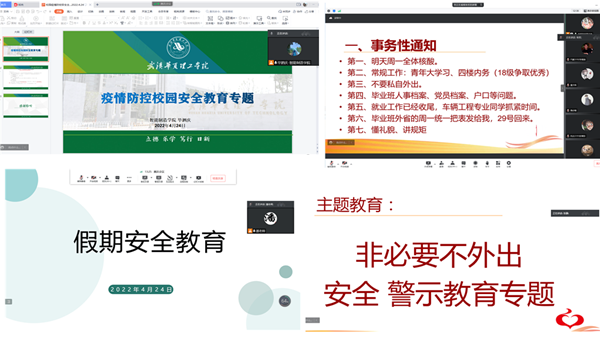 为做好假期前安全教育,确保广大师生身体健康和校园安全稳定,2022年4月24日晚,我院通过腾讯会议形式组织开展主题为“疫情防控常态下校园安全”的晚点评教育,各年级辅导员主持,全体学生参加。