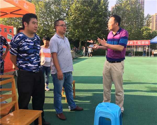 在汽车大本营,刘源书记首先看望了几位在军训中身体出现不适的新生,和他们交流了训练和生活情况,并叮嘱他们在军训中一定要注意安全,在完成军训任务的同时不能让自己的身体受到伤害。今天正值我院举行“建军90周年红歌大赛”,并且我院获得了全院一等奖的好成绩,刘源书记参观了学生们的表演,并祝贺他们取得了好成绩,为我院争光添彩。最后刘源书记和17级新生辅导员杨海龙老师交流了军训各项工作的进展情况,刘源书记表示,要通过军训来磨练新生的意志力,锻炼他们独立生活的能力,让他们能够尽早的适应大学生活。