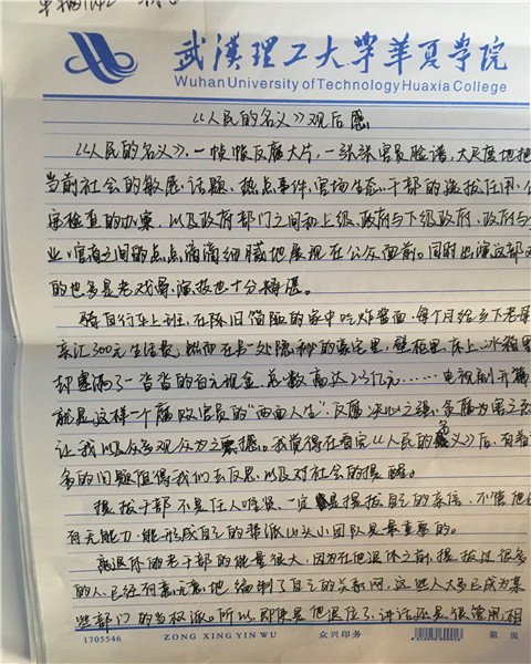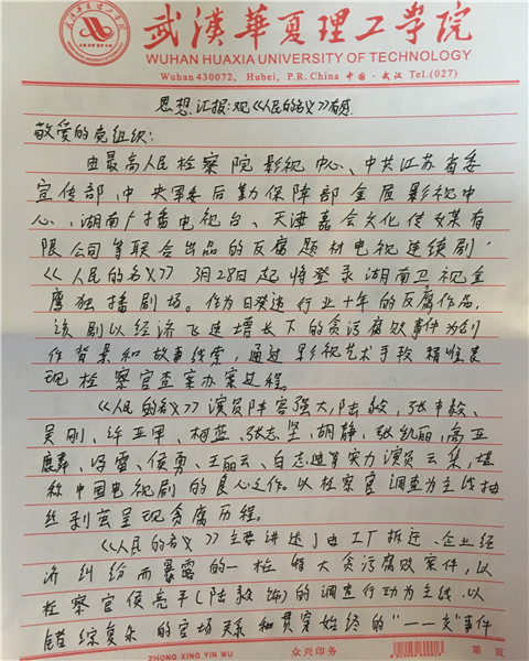 近期,评分超高的电视剧《人民的名义》热播,以其独特的反腐主题引起强烈反响。汽车工程学院14级党支部集中观看了《人民的名义》,并要求观看的同学撰写观后感。
