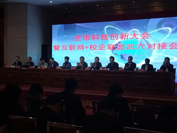 会议分为两项,8:00-9:30召开全市科技创新大会。会议正式开始前首先参会人员观看武穴市宣传片。接下来迅达药业公司、成都彩虹有限公司、武汉纺织大学都分别进行了发言。武穴市人民政府与武汉轻工业大学签订市校合作框架协议。然后开始进行互联网+校企联盟武穴对接项目签约,其中我校其它院教师有对接项目。最后黄冈市、武穴市相关领导都对本次会议的重要性作了讲话。