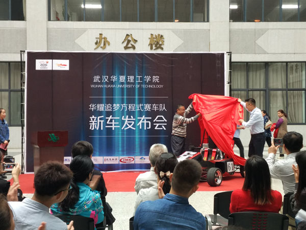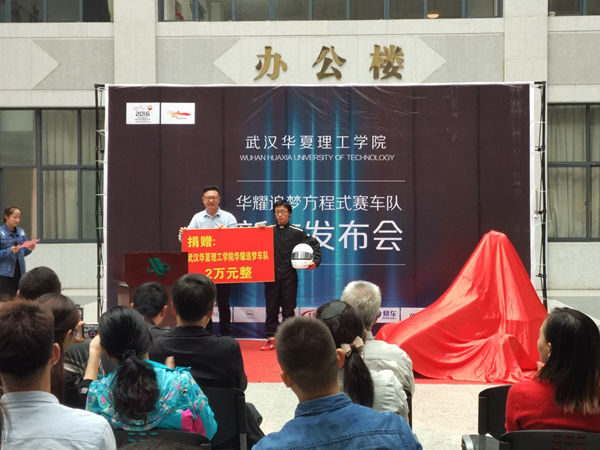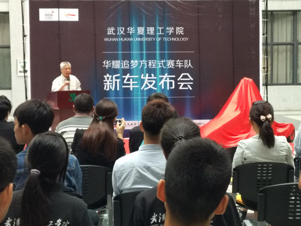 发布会开始,唐新蓬院长致词,唐院长对学校各级领导的关心和支持以及车队队员和指导老师的辛勤付出表示感谢,并表示学院对此次比赛高度重视,希望车队以饱满的热情做好参赛准备,争创佳绩,为我校争光。随后华耀追梦车队的代表邓中锐同学介绍了赛车的情况,虽然赛车的制造过程有很多困难和挫折,但是同学们并没有放弃,在老师的指导下一一解决了这些绊脚石。随后毛云峰经理为华耀追梦车队进行捐助授牌发布会最后,党委副书记、副校长李海明和毛云峰经理为方程式赛车揭幕。