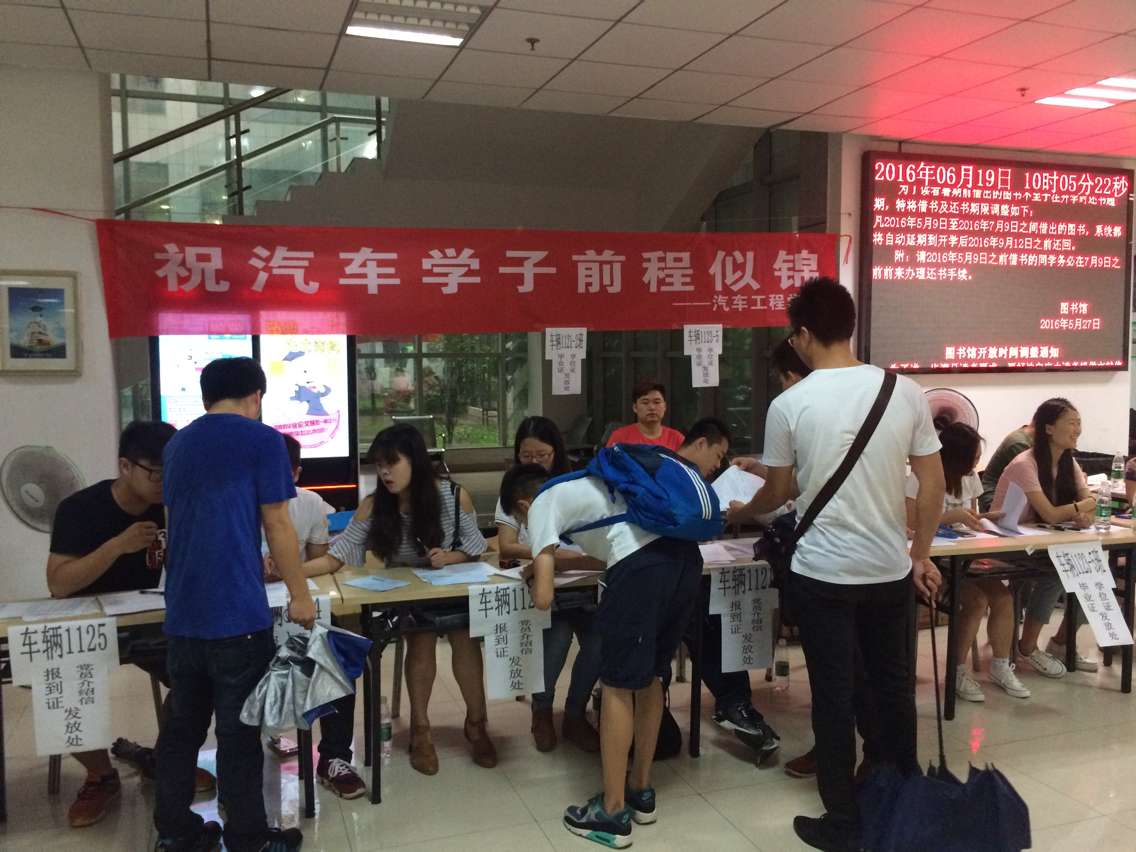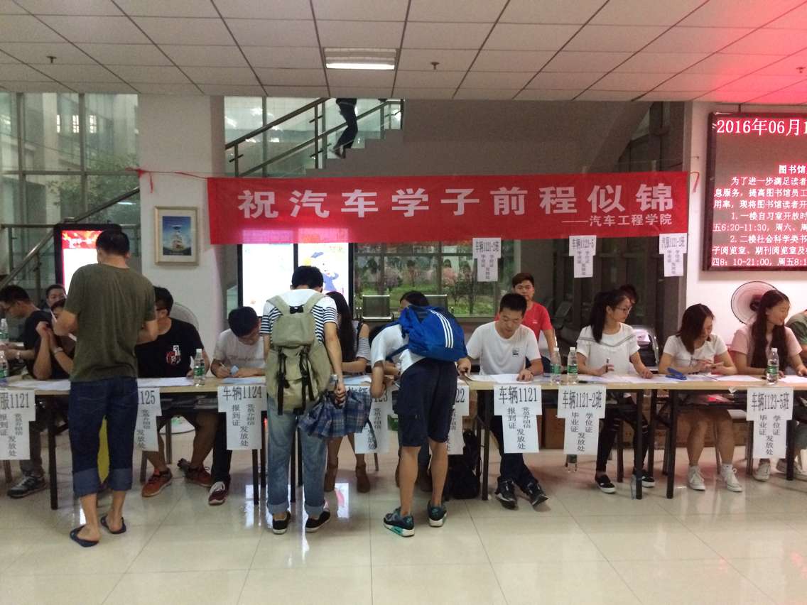 2016年6月19日-20日汽车工程学院在图书馆一楼办理毕业生离校手续。毕业生们在图书馆一楼办理退还寝室钥匙、发放毕业照、注销学生证、领取毕业证等手续。毕业生们办理手续的表情也各自不一,因为在办理完这些手续后,真正的意味着要从单纯的象牙塔迈入社会了。这是很多人一生中最重要的最关键的战役,但正如打仗不能光靠拼搏精神和澎湃激情,也不能忘掉在校时那些老师的谆谆教诲,不能忘掉作为一名华夏学子应有的风采。