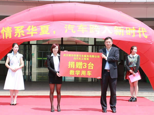 开幕式首先由汽车工程系系主任唐新蓬教授致开幕词,唐主任说道:“汽车行业的新发展和产业结构调整为汽车专业建设带来了新机遇。希望通过汽车文化节举办的各类活动,将新时代汽车概念传播到校园,推动校风和学风建设向更深层次发展。”随后,武汉精华群豪汽车服务有限公司蔡经理上台致辞。接着,武汉精华群豪汽车服务有限公司对我院汽车工程系教学用车的捐赠仪式正式开始,公司代表蔡经理与汽车工程系党总支书记刘源在热烈的掌声中完成捐赠牌的交接仪式。