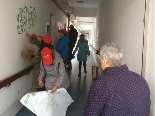 到达目的地后,院方负责人向志愿者介绍了老人的一些情况,随后,青协志愿者开始分组工作,有的给老人打扫房间,有的帮楼管阿姨在贴壁画,忙完这些后,志愿者们开始给老人发放自己准备的水果,陪老人聊天,听老人们讲他们那个年代的事情和故事。