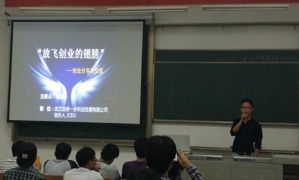 为响应我系“分级管理,分类培养”的指导方针,10月18日晚上7点,13级辅导员杨海龙老师邀请我院汽车系11级优秀校友,武汉浩奇一步科技发展有限公司创办人马育鸣学长在1-407晚点名教室和大家交流创业经验。