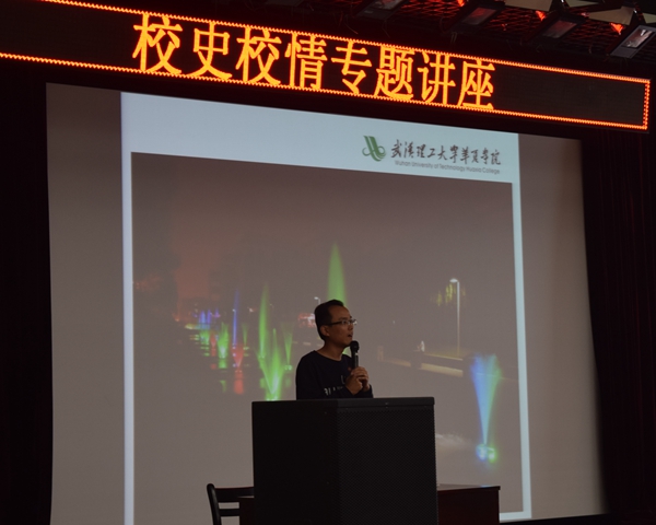 张老师首先向2015级新生介绍了本次讲座的目的和意义,他详细介绍了学校的发展史,讲述了我校创始人之一艾总的部分优秀事例,以及我校部分优秀学子的先进事例;随后展示一些他在学校用相机记录的美景和新生来校后的生活照,赢得了阵阵掌声,现场气氛热烈。在演讲过程中,经常与学生进行互动,对向积极回答问题的人赠送精美珍贵校史图书,张老师诙谐幽默的语言,总能让现场笑声不断。