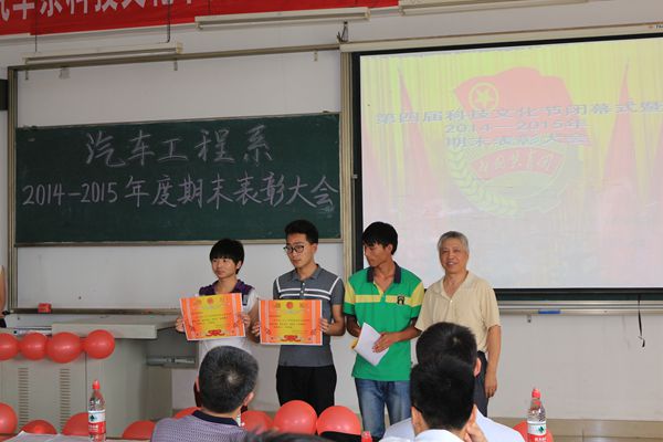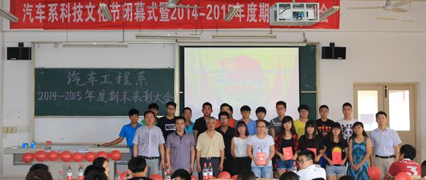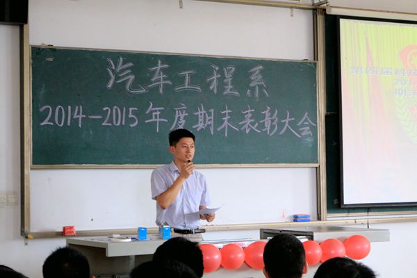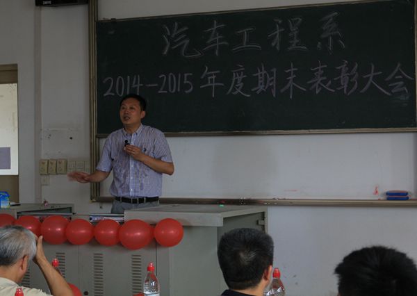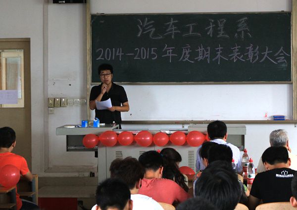 为了总结过去,同时也为了创造更好的未来,汽车工程系于6月24日12:25在2—401举行了2014—2015年度期末表彰大会。汽车工程系主任唐新蓬教授、副主任刘仁兵教授、党总支书记刘源老师、车辆教研室副主任吴焕芹老师、教学行政办曾志娥老师、学工办主任郭杰老师、团总支书记易成老师、团总支副书记刘峰老师、辅导员杨海龙老师以及团学联各部门负责人参加了此次表彰会议。