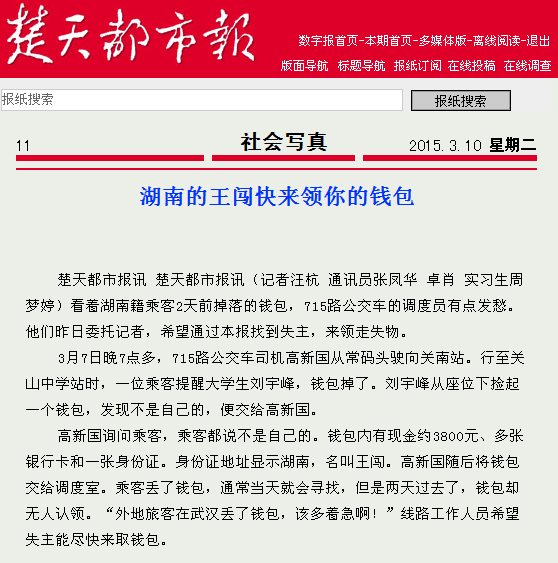 “刘宇峰同学,你好,我是湖南株洲的王闯,3月7日,我到了武汉,由于自己粗心丢失了钱包,是你捡到交到公交公司,你拾金不昩的高尚品质很让人感动,特别是在当今社会,你的高尚品德,不图回报,让人十分敬佩,在这我只能对你表示我最诚挚的谢意和敬意,中国如有更多你这样的人,社会将更加温馨!能否告之我你是华夏学院哪个系哪个班吗?”这是一位失主在找回钱包后发给刘宇峰的感谢短信。