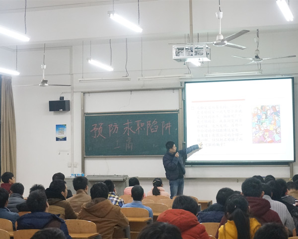 首先郭主任提醒大家目前招聘骗术分为三大类,分别为:虚假职业信息类、压榨应聘者类、黑职介作祟类,他在介绍这些骗术期间还举了一些典型例子来说明这些骗术的危害性并以此告诫各位学生求职过程中谨防诈骗;然后开始向大家介绍预防求职陷阱的方法并告诫大家面对各种体面职业的诱惑要仔细询问工作细节和用人单位信息,必须签订就业协议,口说无凭,立字为据,按照正常程序就职;接着郭主任提醒大家求职过程中要格外小心传销陷阱;最后郭主任为大家详细讲解了填写学校就业管理系统时需要注意的问题。