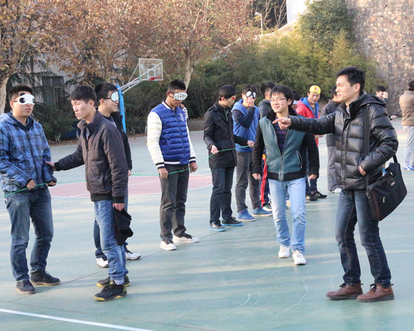 我系13级辅导员张洋早早的来到一食堂篮球场,等待同学们全部到齐后开始主持本次活动。“盲人方阵”的活动规则是:每个班同学一组,共四组分别是车辆一二班,和汽服一二班。所有人的眼睛用眼罩蒙住,要求在“失明”状态下将一根绳子抻成正方形,并且所有同学要均匀分布于绳子四边。活动开始前,参赛的同学们都在进行着紧张的策划。伴随着辅导员张洋“开始”的一声令下,所有人用眼罩蒙住双眼,活动正式开始。四组同学的策略颇为相同,都是先由四名同学将绳子抻成正方形,然后剩余同学分成四组,分别站在正方形的四条边上。虽然说起来简单,但是“盲人”做起来是很困难的。在游戏中在各小组的班长指挥下和同学的合作下,都取理想的结果。