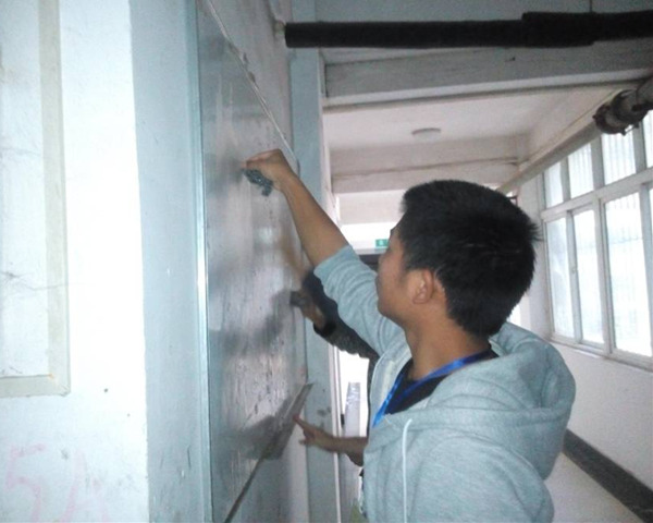 本次祛除牛皮癣的活动主要活动内容是对五号宿舍楼和汽车工程楼的走廊、楼道旁的各种广告纸进行清理。活动开始于12:30,为时四十分钟,广大青协志愿者热情参与了本次活动,积极完成各种任务,他们不怕脏、不畏冷,用抹布将一块块乱糟糟的纸张打湿,用钢刷仔细的将每一处污渍刷干净。志愿者的默契配合使得此次活动很好的完成。