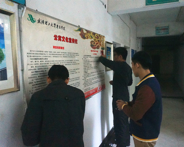 为响应武汉市创建文明城市号召,结合我院创建文明单位工作要求,11月13日中午12:30,我院汽车工程系安全纪律委员会全体人员参与了“祛除牛皮癣,文明我争先”的活动,目的是将墙壁上乱贴的纸张广告清除干净,为在校学生提供更好的学校、生活环境。