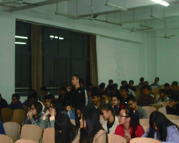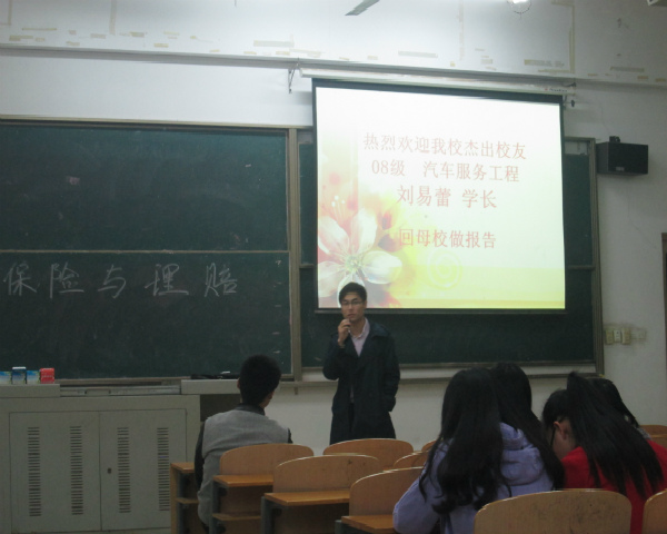 2014年11月2日19:00,第三次“分级管理,分类培养”主题交流会在2教101开展。我院08级汽车服务工程学长刘易蕾回母校为学弟学妹们进行了“保险与理赔”的报告会,分享了自己的工作历程。12级大三学生对此次交流会表现出了极大的兴趣。