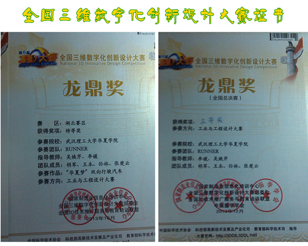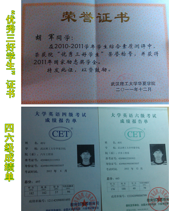 勤奋恳学,斩获无数奖项 全国三维数字创新设计大赛全国总决赛三等奖和湖北赛区特等奖、武汉理工大学华夏学院2010-2011学年“优秀三好学生”、2010-2011学年获得国家励志奖学金、2012-2013学年获得国家奖学金、英语四六级证书…凭借胡军自己的勤奋好学和坚持不懈,他在大学四年学习生活中过的很充实,在和胡军的谈话中他多次提及到榜样的力量。在刚入校的时候,我校08级优秀校友汽车工程系的张弛同学的一场交流会深深地影响了他。从此,他走上了科研之路。除了榜样,他还提及到环境的影响,特别是宿舍文化的影响,一个良好的氛围会让我们的学习生活有大幅度的提升,只有有一个好的团体才会取得更好的成就。他把此次参加三维创新设计大赛取得的成绩归功于团队runner的团结和细致分工,充分利用时间去图书馆学习有关技术知识,在每个周五下午闭馆以后都回到宿舍做好自己的工作,坚持了两个月,才在比赛中获得奖项。他特别重视团队的团结和时间的利用。