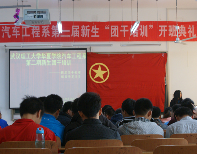 2013年11月14日中午12:30,汽车工程系举行第二届新生“团干培训”开班典礼。汽车工程系团总支书记.、辅导员杨海龙、副书记郝永坤、学生会主席余志超、副主席张楚、张康、张晶、及各部门部长、系学生会各干事及各班班长、团支书参加典礼。