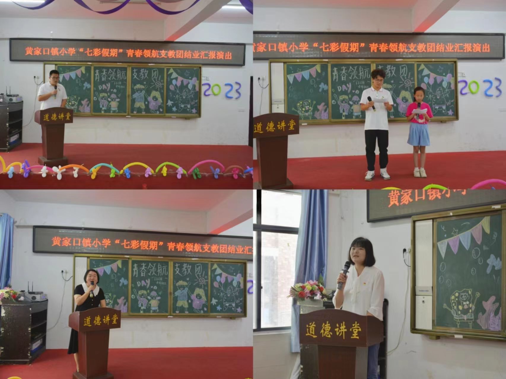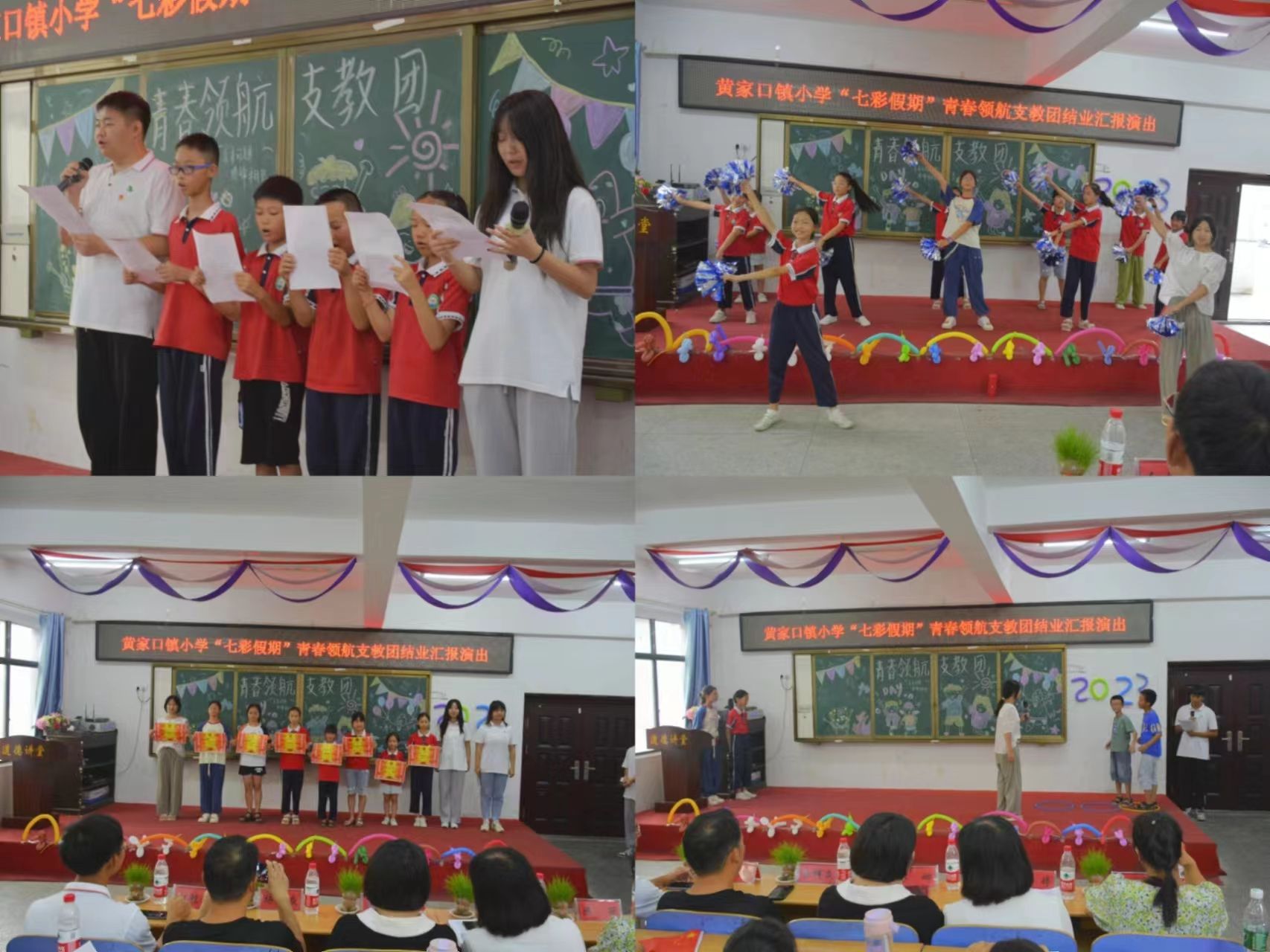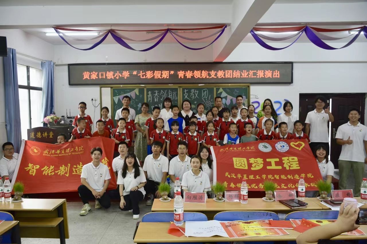 7月25日,洪湖黄家口镇小学的“七彩假期”青春领航支教团圆满完成了为期半个月的支教任务。为了向大家展示孩子们在支教期间的成果和收获,我们举办了一场精彩纷呈的结业汇报演出。由洪湖市少先队总辅导员徐娜、黄家口镇团委书记桂婷、黄家口镇团委干事陈丽、黄家口镇⼩学副校长杨辉焱、黄家口镇⼩学办公室主任喻欣、武汉华夏理工学院智能制造学院学工办主任向胜涛出席活动,青春领航支教团带队老师朱至立老师及全体志愿者、黄家口镇小学“七彩假期”学生及家长等80余人参加此次汇报演出。