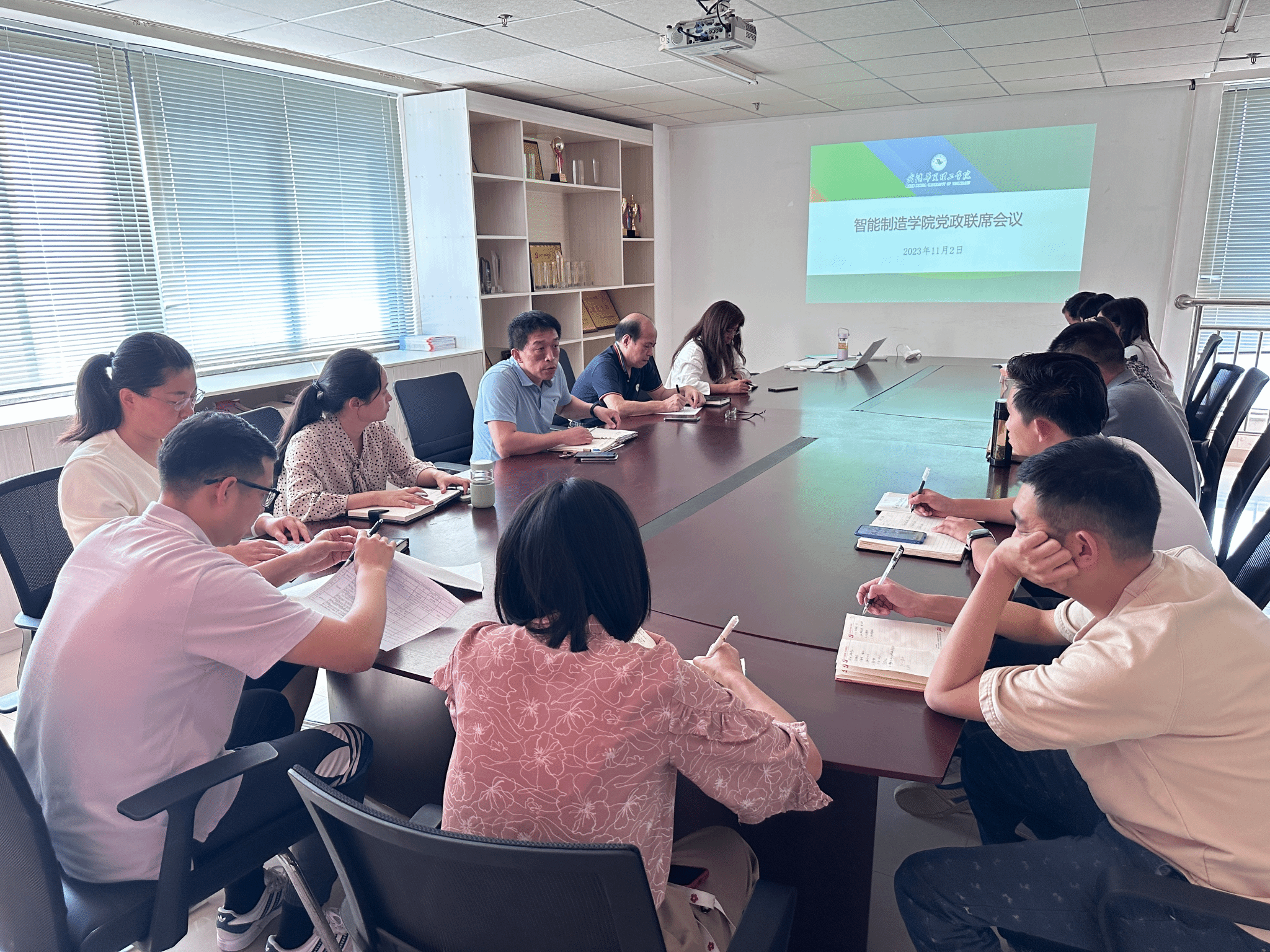 2023年11月2日,智能制造学院在综合楼0919会议室召开了本学期第二次党政联席会议。院长余世浩,党总支书记张亮,副院长吴焕芹、齐洪方,院长助理汪芳、张琳琅,各系部实验中心(副)主任孙文文、叶仁虎、熊琛琛、刘维、冯理、宋丹妮、李茂、汤剑,党总支组织员祝炜黎、学工办主任向胜涛、教学办主任徐林娟参加会议。