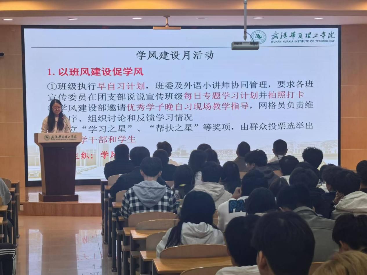 会议上团总支书记郭薇强调了学风建设的重要性,并指出应以班风、室风、院风三个方面全面推动,包括早自习计划、优秀学子指导、学习之星评选、班级故事征文等学风建设活动,宿舍内务检查、公寓文化活动、寝室文化展示、寝室故事征文等室风建设举措,以及查课制度、课堂巡查、家长联系等院风建设措施。接着学风干部代表徐哲恒强调了时间管理在提升学习效率中的关键作用,分享了自己如何利用日程规划和优先级排序来合理安排学习时间。而学生代表熊雅颖则分享了她在面对学习挑战时如何保持积极心态和寻找解决方案的过程。