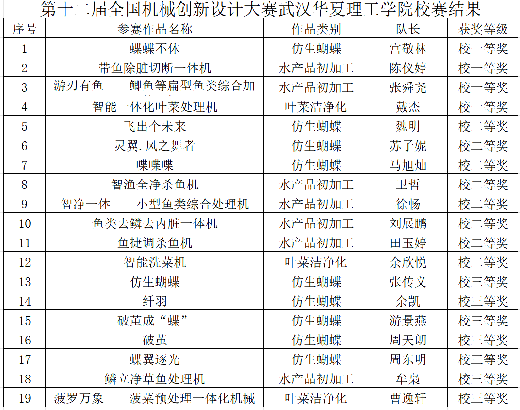 第十二届全国大学生机械创新设计大赛武汉华夏理工学院校赛于2025年12月18日进行,通过线上电子版资料评审、线下答辩及评委提问等形式进行。经校评审专家严格评审,共同商议评定,选出校赛一等奖4项、二等奖8项、三等奖7项,现将结果公示如下。