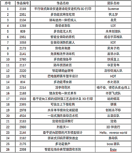 根据《关于2020第13届全国3D大赛初赛的说明》和《关于举办 2020第13届全国三维数字化创新设计大赛的通知》文件要求,经学院推荐、网络作品初审、专家组评审等环节。现对推荐参加2020全国3D大赛湖北省赛区竞赛的26件作品进行公示,具体信息如下: