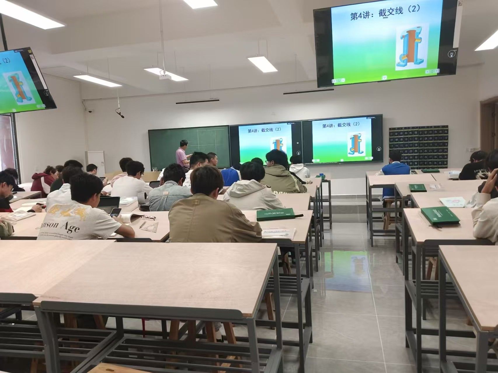 今日,在本学期《工程制图》的课堂上,朱希夫教授一改传统“教师讲、学生听”的满堂灌模式,大胆尝试了“2+2”分段式教学。课程的前两节课,朱教授以精炼的语言和生动的案例,系统讲解了核心理论框架,重点突出,逻辑清晰。而在接下来的两节课中,课堂主角由教师转变为学生。同学们根据刚学到的理论知识,当堂完成朱教授精心设计的实践作业。在此期间,朱教授走下讲台,在同学们中间巡回指导,及时为遇到困难的学生提供一对一的解答和启发。