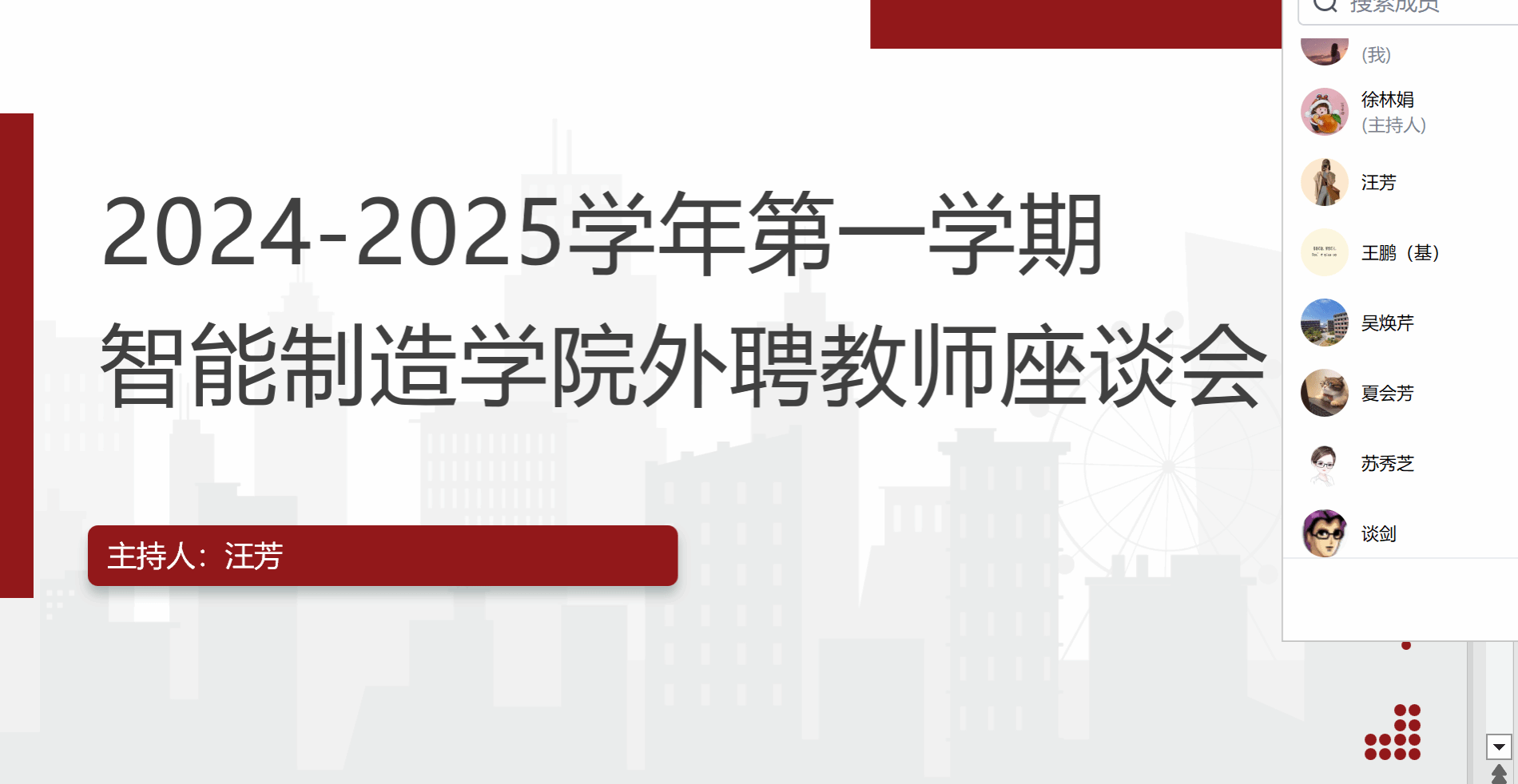 11月14日晚上7:30,智能制造学院召开了外聘兼职教师在线座谈会,会议由教学副院长汪芳主持,教学办及部分外聘教师代表参会。