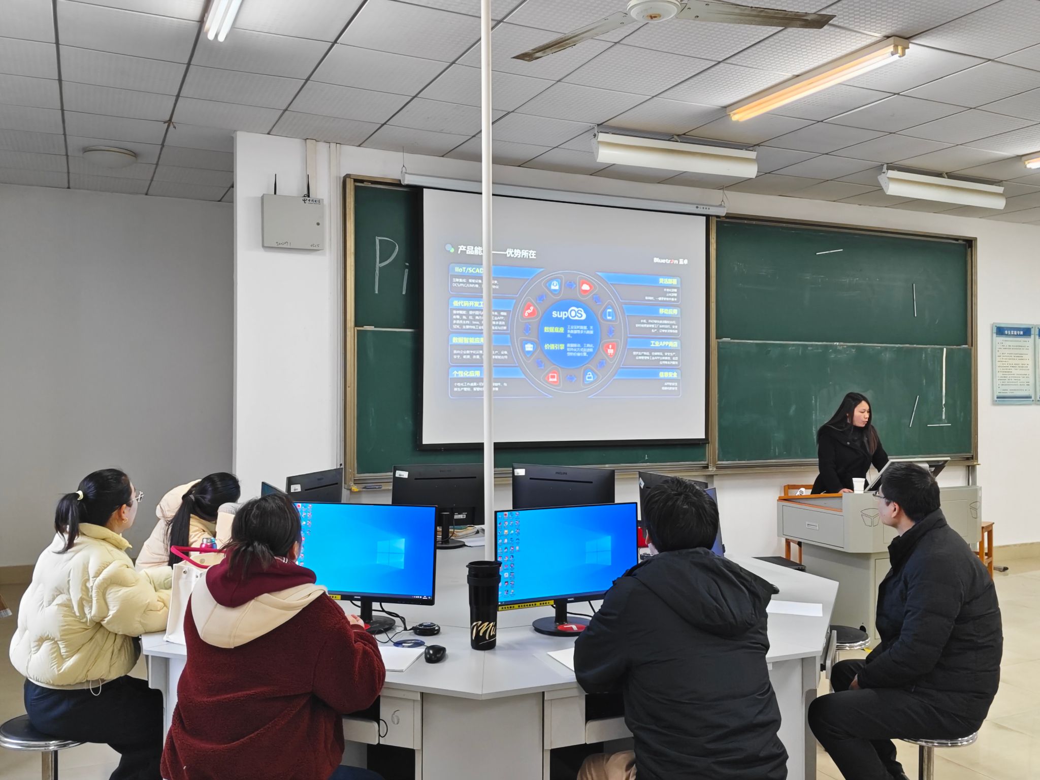 李晶首先介绍了SupOS工业互联网平台基本功能与应用案例、蓝卓云学堂、工业互联网资格认证等方面内容;随后,陈飞详细讲解了SupOS工业互联网平台中设备节点管理与数据采集、对象模型与数字工厂建模、工业APP组态与数据可视化等主要流程与方法,并以我院实验中心的设备数据采集与APP开发为例进行了操作演示;最后,相关系部老师与企业技术人员一起针对SupOS工业互联网平台在工业物联网、工业大数据、智能制造系统综合设计等相关课程实践教学中的应用进行了深入探讨,明确了相关课程实践教学内容与方式,共同推进了我院关于工业互联网方面课程的产教融合建设。