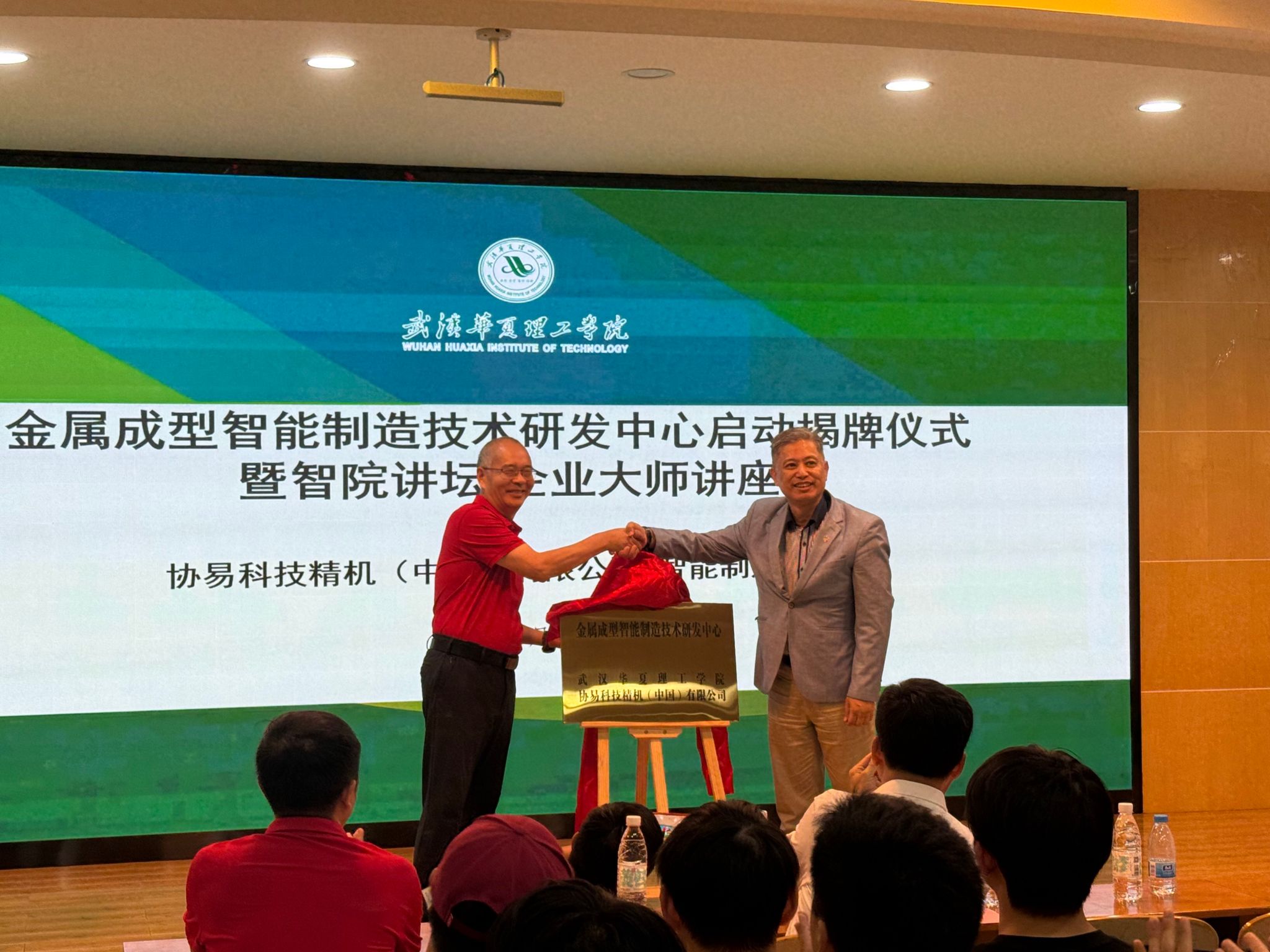 仪式现场,协易科技精机(中国)有限公司总经理刘国旺、武汉华夏理工学院副校长丁成忠共同为金属成型智能制造技术研发中心揭牌。协易科技精机(中国)有限公司为研发中心投入启动经费3万元,用于技术攻关、课题研究,旨在通过产学研融合,推动金属成型智能制造领域的技术突破与人才培养,实现校企资源互补。