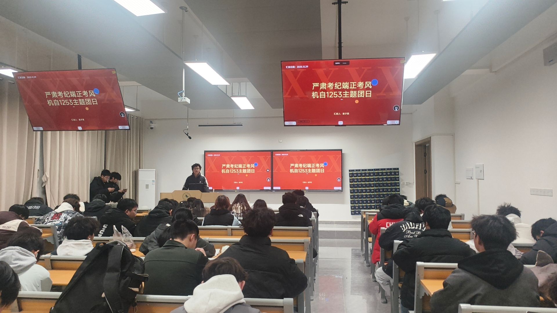 为进一步加强班级学风建设,营造公平公正、诚实守信的考试氛围,引导同学们树立正确的考试观,12月29日,机自1253班在教学楼C314教室开展了以“严肃考纪,端正考风”为主题的团日活动。 此次活动班级全部成员参加。