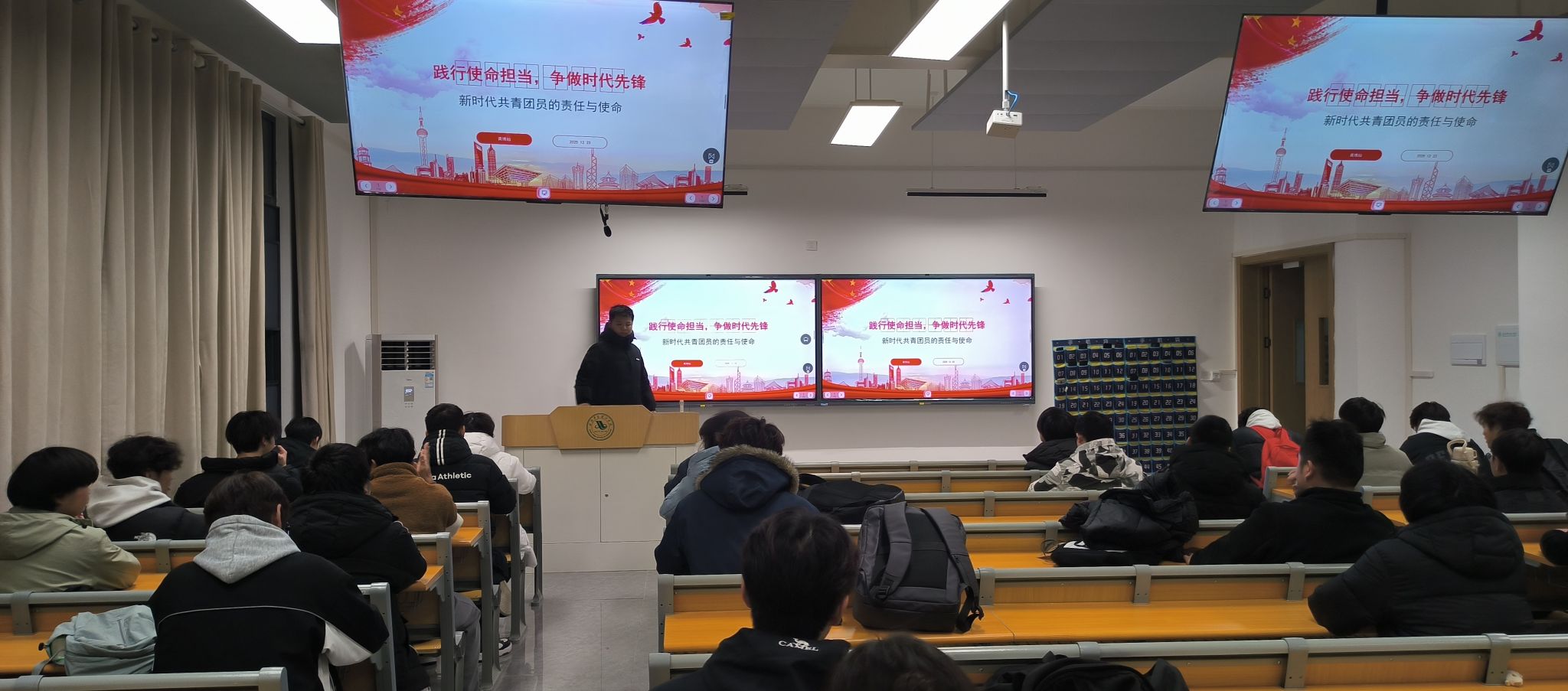 为深化共青团员的责任意识与使命担当,引导青年学子在新时代勇立潮头、奋勇争先,12月23日18:30,智能制造学院成型1251班在晚自习教室组织开展了以“践行使命担当,争做时代先锋——新时代共青团员的责任与使命”为主题的团日活动。