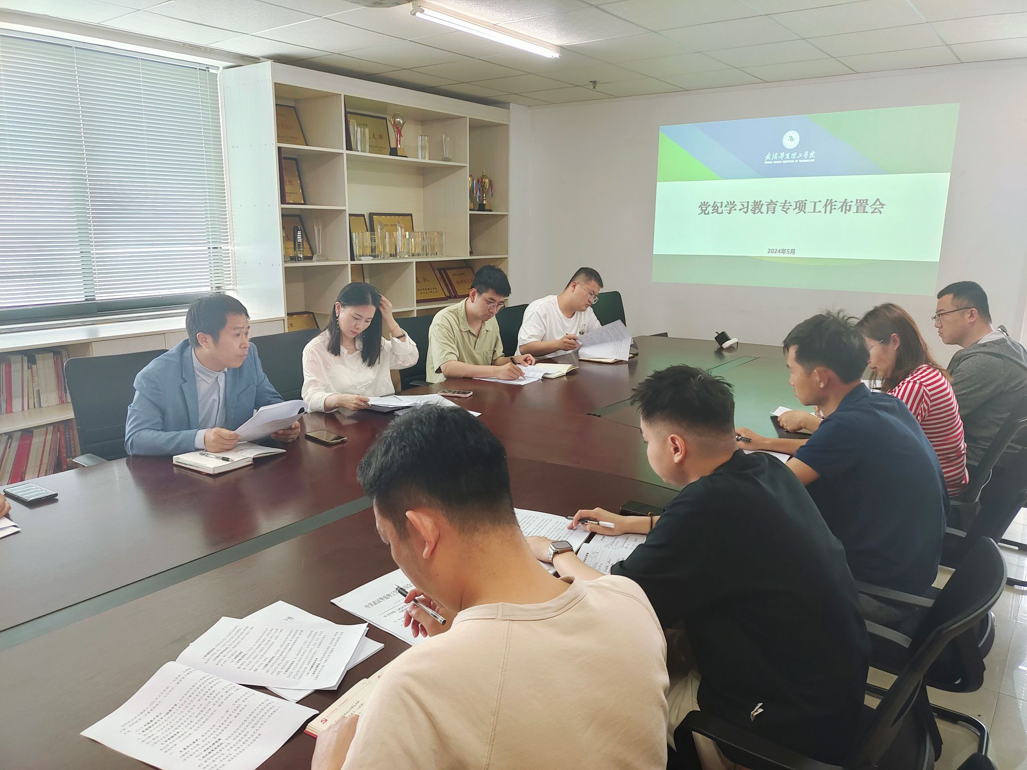 5月7日,智能制造学院在综合楼919会议室召开党纪学习教育专项工作布置会,学院党总支书记靳路民、党总支组织员祝炜黎、学工办主任向胜涛和教工、学生党支部书记参加会议,会议由党总支书记靳路民主持。
