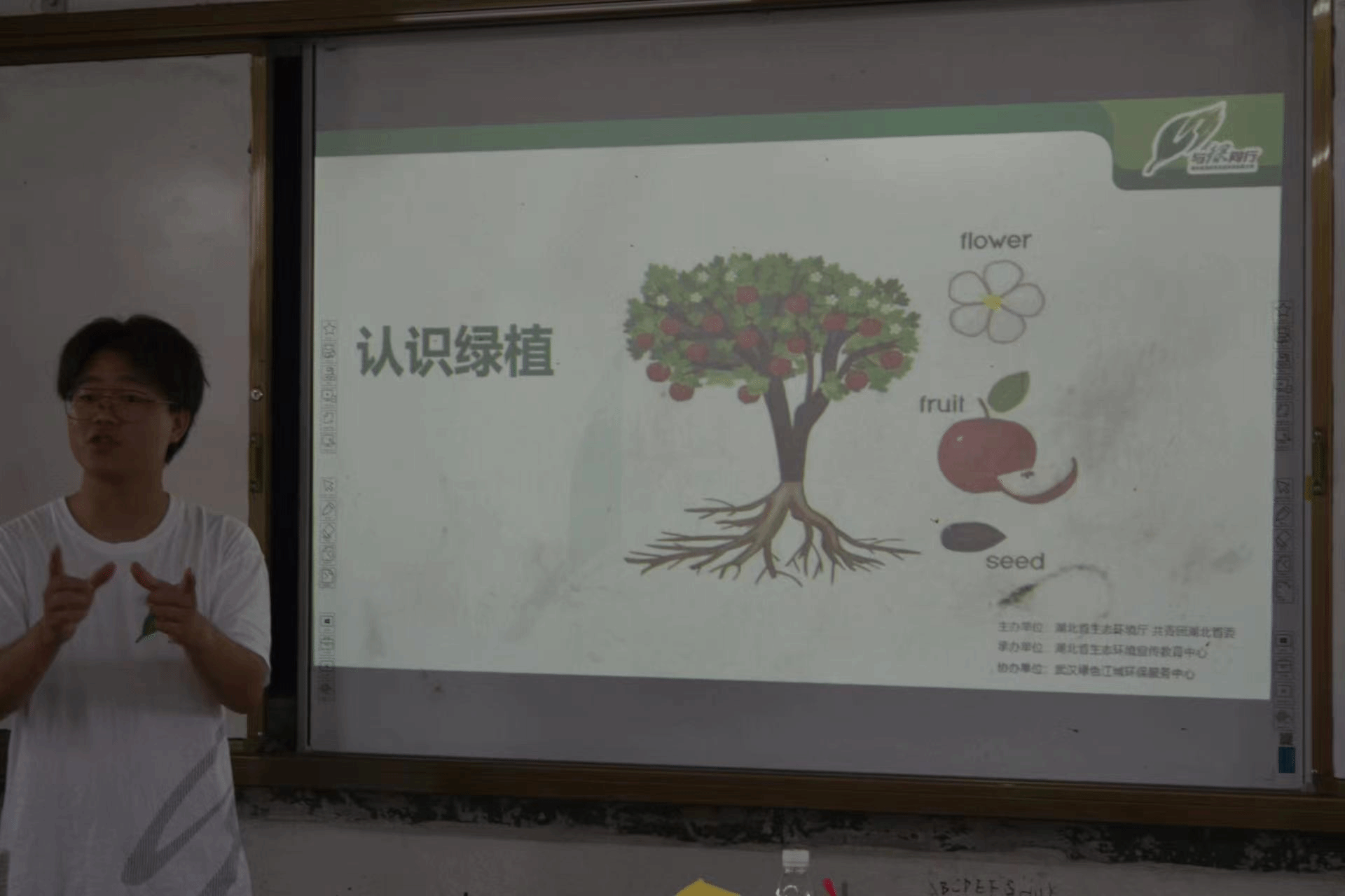 走进绿植课堂,可以看见讲台上摆放着精致的示范绿植,旁边还整齐地摆放着各类园艺工具。台下的课桌上,每一张都摆放着一个草头娃娃。志愿者田丰站在讲台上,背后大屏幕上展示着精美的绿植图片和详细的养殖步骤。志愿者的声音清晰而温和,充满了热情和耐心,仿佛在讲述着一个个生命与成长的神秘世界。