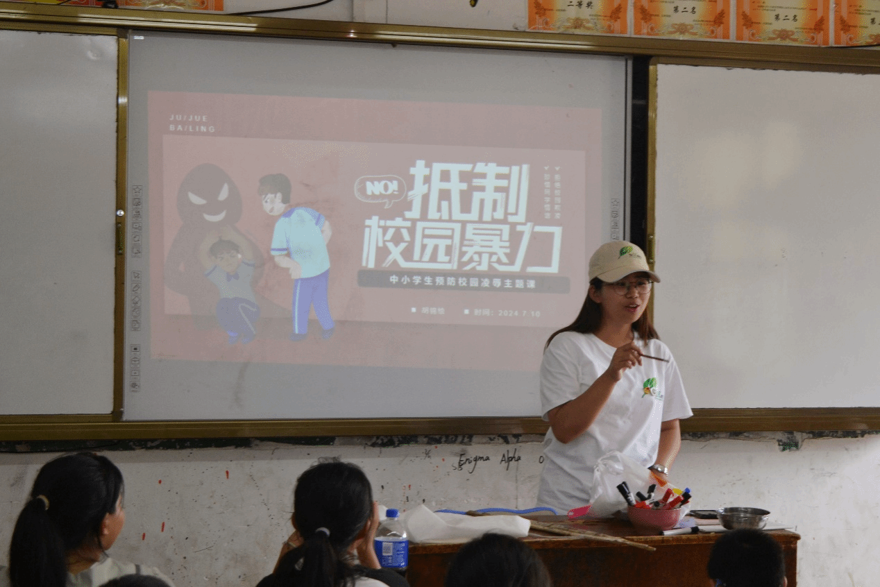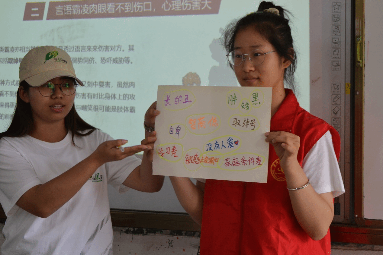 为提高乡村孩子对校园欺凌的认识和防范意识,7月11日,青春领航支教团在湖北省蕲春县向桥中学开展法治安全教育进校园课程活动。志愿者们通过宣讲、情景演绎等多种形式,生动地向学生们展示了校园欺凌的各种表现形式及其危害。他们由网络热点校园欺凌事件引入,与学生共同探讨“什么是校园欺凌”以及“校园欺凌有哪些行为”,揭开校园欺凌的伪装,帮助孩子们认识和辨别不良行为。