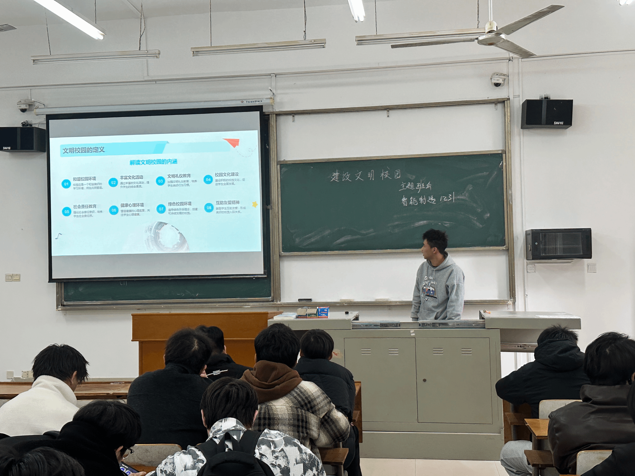 讨论环节,大家踊跃发言。学习委员提议设立“文明学习互助组”,帮扶学习困难同学,杜绝抄袭、吵闹等不良学风;文体委员则策划文明主题的课间活动,以趣味竞赛传播文明知识。而后组织委员为大家讲解了文明校园PPT。