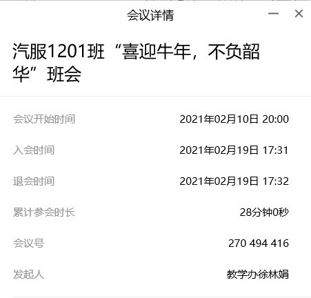 2021年2月10日晚上8点,汽服1201班导师班主任徐林娟组织召开了“喜迎牛年,不负韶华”第一学期总结主题班会。此次班会以腾讯会议形式开展,全班同学、学长班主任及辅导员都准时参加。