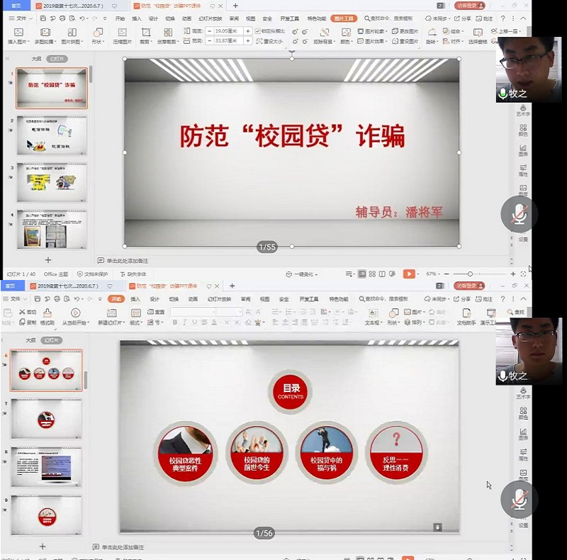 远离网贷,莫负青春债。网络贷款的严重后果和不良影响是显著的,为让学生对网络贷款风险有新的理解和认识,增强安全防范意识,提高对骗贷行为的警惕和甄别能力,我院2019级辅导员潘将军于6月7日18:30在线上开展防范“校园贷”诈骗教育,机自1191班、机械1191-1198班全体成员均参加。