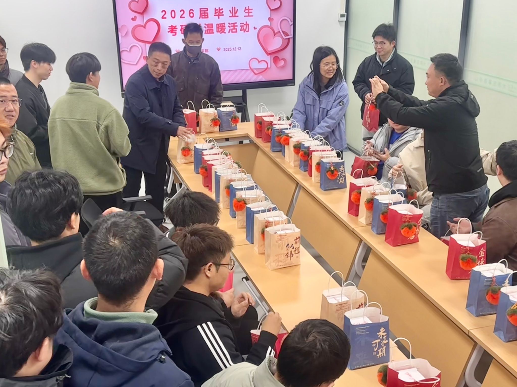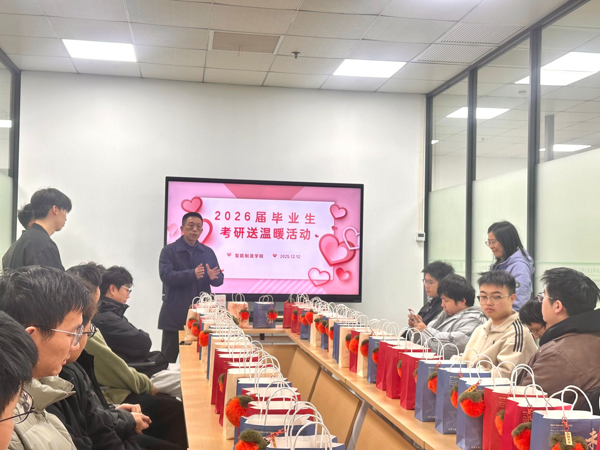 12月12日,智能制造学院于综合楼学工会议室开展“考研温暖计划”暖心活动,为正在冲刺阶段的2026届考研学子集中送温暖、添动力。活动尚未开始,现场已洋溢着温暖的期待,精心准备的定制“暖心能量包”整齐摆放,寄托着学院对学子们的深切关怀与美好祝愿。